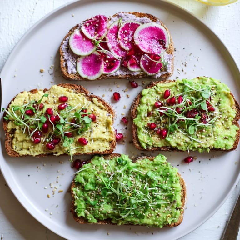 - Top each toast with radish slices, pomegranate seeds, and microgreens.