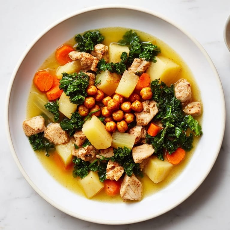 Pin A nourishing and flavorful soup featuring tender chicken, hearty kale, and crunchy roasted chickpeas for a healthy twist on classic comfort food.