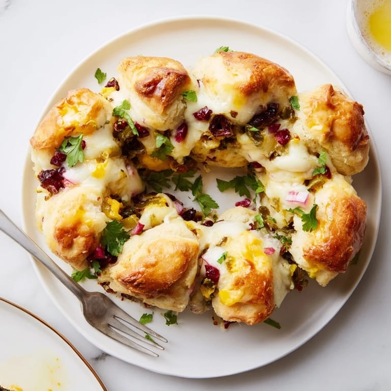 Pin A festive, zesty pull-apart bread featuring tangy cranberry&jalapeño dip layered between pillowy bread pieces and gooey cheese, perfect for holiday gatherings or game day snacks.