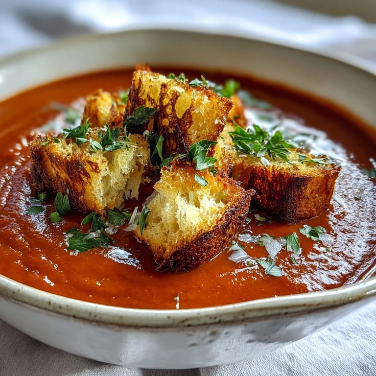 A silky soup without texture can feel incomplete, like listening to music without the drums. Croutons solve this problem while bringing something else valuable, a reminder that this dish respects your palate enough to offer contrasts. Day-old bread is genuinely better for this because it absorbs the seasoned oil more evenly and crisps rather than soaks. I learned this the hard way after using fresh bread that turned soggy and sad, and I never made that mistake twice. There's something about that satisfying crunch that makes people slow down and actually taste what they're eating.