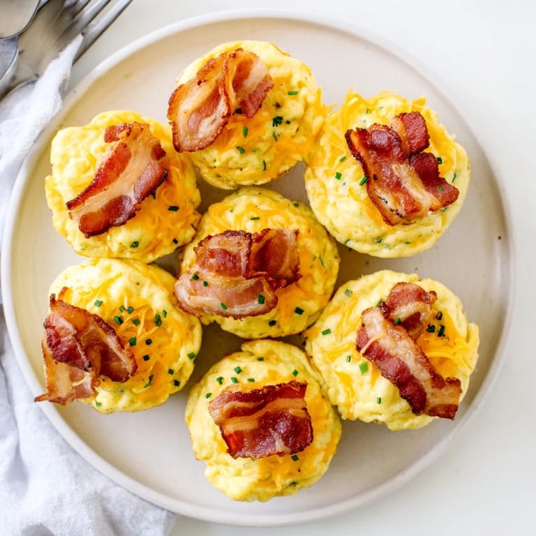 Pin Fluffy scrambled eggs baked in muffin cups, topped with crispy bacon strips—perfect for an easy, crowd-pleasing brunch side.