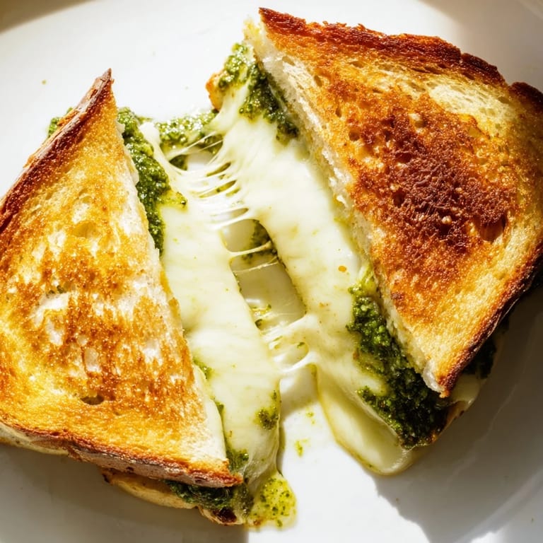 This sandwich is perfect on its own, but I love pairing it with a simple arugula salad dressed with lemon and olive oil or a bowl of creamy tomato soup for dipping. Sometimes I tuck in a few slices of ripe tomato or roasted red pepper before grilling for extra sweetness and color. If you want a little crunch, a handful of baby spinach or arugula inside the sandwich adds a fresh, peppery bite that complements the pesto beautifully.