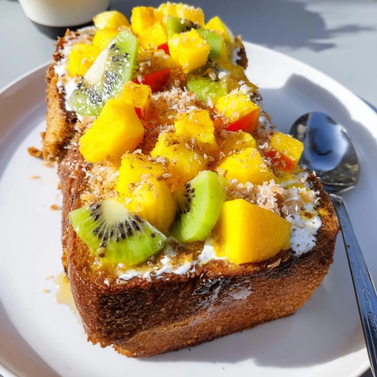 Pin A vibrant, creamy take on the viral custard toast, featuring coconut yogurt and a medley of fresh tropical fruits. The perfect balance of crisp, creamy, and fruity goodness for breakfast or brunch.