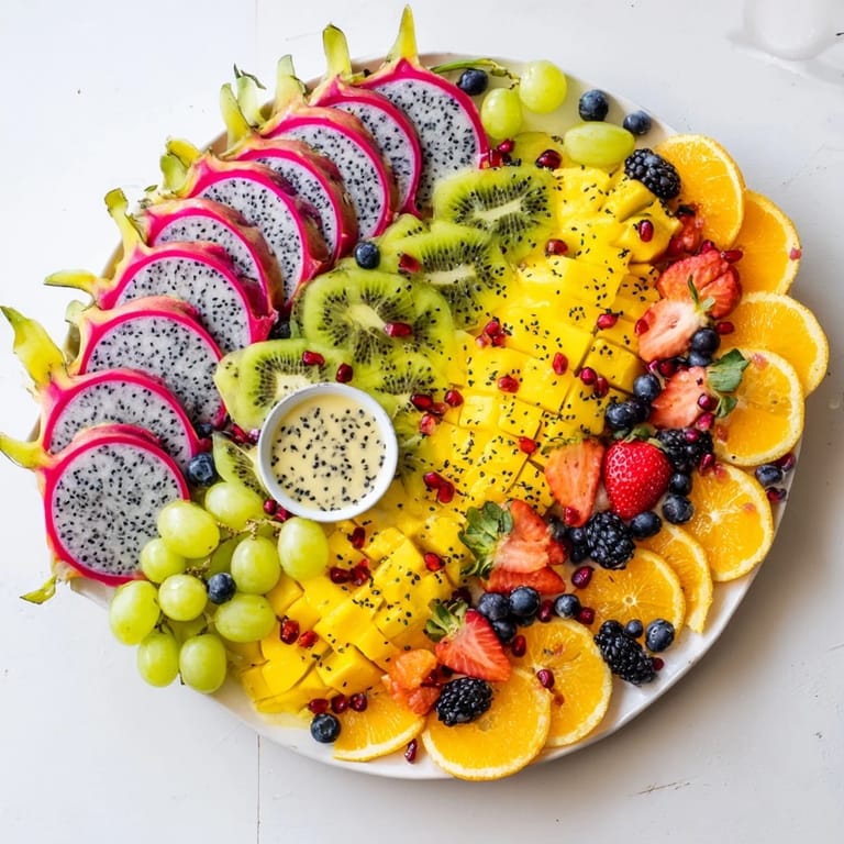- Fruit Selection: 1 small dragon fruit peeled and sliced, 1 cup green grapes halved, 1 cup blueberries, 1 cup strawberries hulled and sliced, 2 kiwis peeled and sliced, 1 mango peeled and thinly sliced, 1 small pineapple peeled and cut into triangles, 1 orange peeled and segmented, 1/2 cup pomegranate seeds