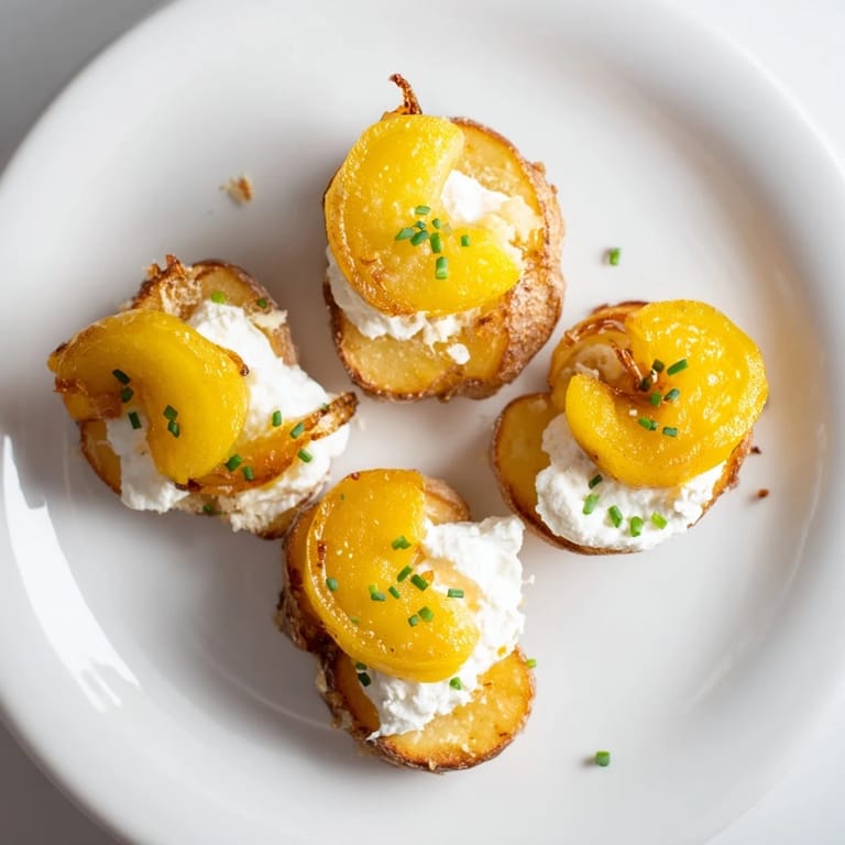 - Once potatoes are roasted, top each round with a small dollop of the cheese mixture. Add a spoonful of caramelized onions on top.